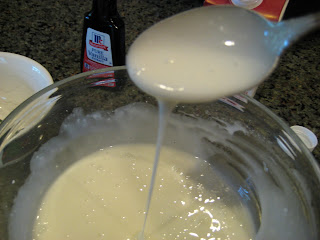 Once you've got the consistency down, add a drop or two of vanilla and stir well. (Warning: vanilla will slightly color your white frosting-- if you want the pure-white color, don't bother with the frosting flavoring.)